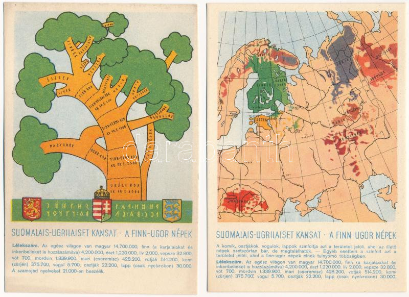 Description: A finn-ugor (finnugor) népek; a Sugurahvaste Instituut (Rokonnépek Intézete) kiadása / Finno-Ugric language family map - 2 db régi képeslap (az egyik vágott) / 2 pre-1945 postcards (one card is cut)