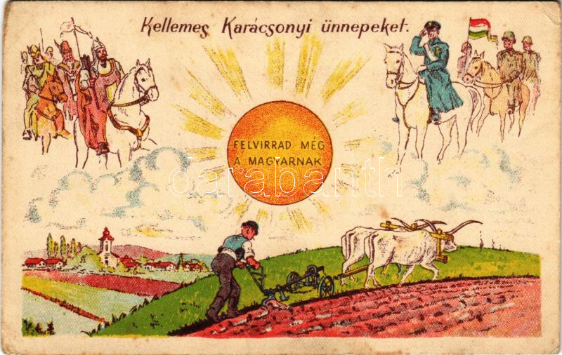 Description: Kellemes Karácsonyi ünnepeket! Felvirrad még a magyarnak! Horthy Miklós fehér lovon / Christmas greeting Hungarian irredenta propaganda with Regent Horthy (EK)