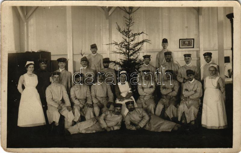 Description: 1915 Wschowa, Fraustadt; osztrák-magyar katonák és német matrózok csoportja vöröskeresztes nővérekkel és karácsonyfával egy katonai kórházban / WWI Austro-Hungarian K.u.K. military, group of K.u.K. soldiers and German mariners with Red Cross nurses and Christmas tree in a field hospital. photo + "RESERVELAZARETT FRAUSTADT" (EM)
