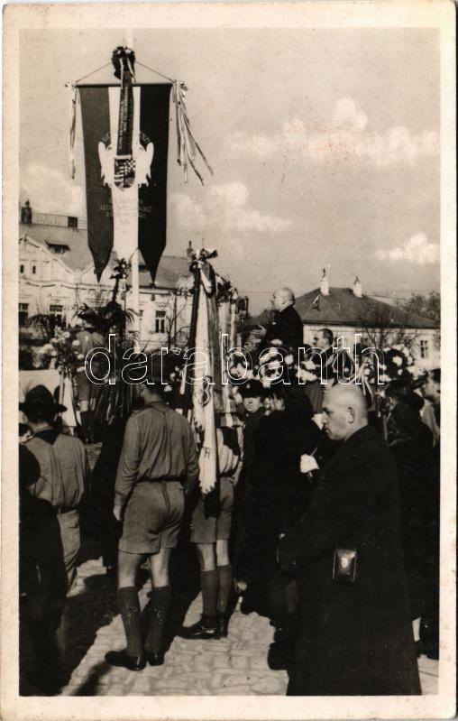 Description: 1938 Léva, Levice; Ipolyság által Léva városának adományozott országzászló ünneplése, bevonulás, cserkészek. Hajdu felvétele / celebration of the Hungarian flag the town of Sahy donated, entry of the Hungarian troops, boy scouts + "1938 Léva visszatért" So. Stpl. (fl)