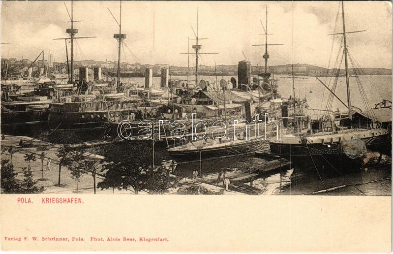 1905 SMS PELIKAN az Osztrák-Magyar Haditengerészet raktárhajója a kikötőben / K.u.K. Kriegsmarine / Austro-Hungarian Navy, mariners of SMS Pelikan admiral's yacht and torpedo depot ship at the port. F.W. Schrinner, Phot. Alois Beer (ragasztónyom / gluemark)