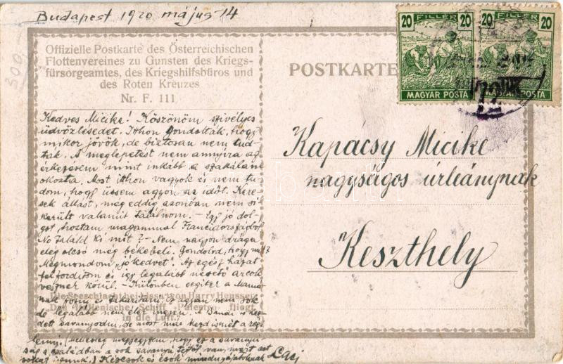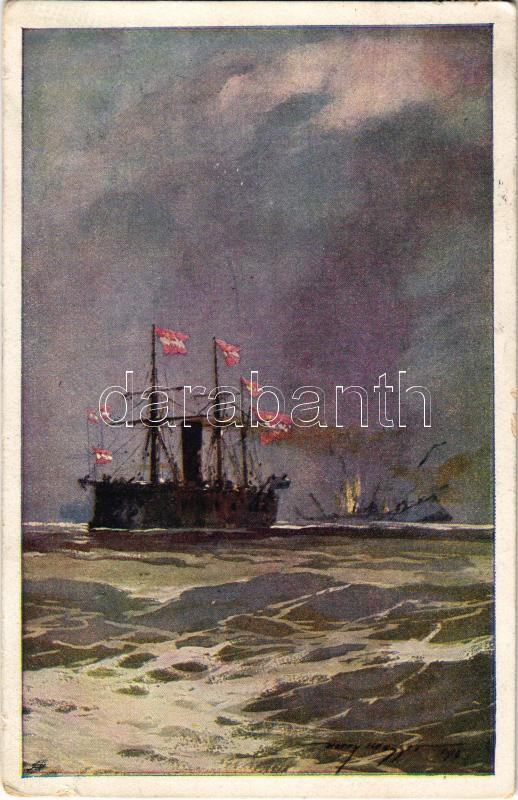 1920 Die Seeschlacht bei Lissa (Vis). Das Italienische Schiff "Palestro" fliegt in die Luft. Offizielle Postkarte des Österreichischen Flottenvereines zu Gunsten des Kriegsfürsorgeamtes, des Kriegshilfsbüros und des Roten Kreuzes Nr. F. 111. / Lissai csata, "Palestro" olasz ágyúnaszád elsüllyesztése / Austro-Hungarian Navy, K.u.K. Kriegsmarine, Battle of Lissa (1866), the sinking of Italian gunboat "Palestro" s: Harry Heusser (small tear)