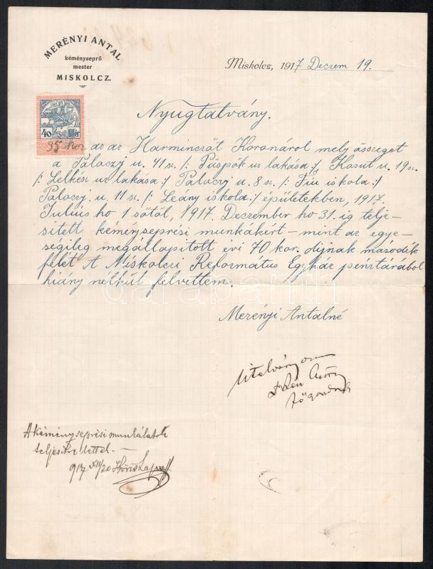 1930 Miskolc Merényi Antal kéményseprő mester fejléces számla