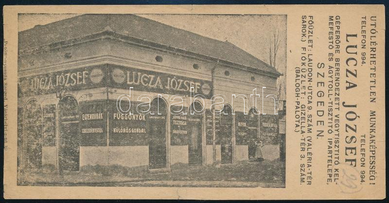 cca 1910 Szeged, Lucza József Géperőre Berendezett Vegytisztító Kelmef... https://www.darabanth.com/en/478-Online-auction/478.0/Art-and-other-collectibles/Advertisement~283/cca-1910-Szeged-Lucza-Jozsef-Geperore-Berendezett-Vegytisztito-Kelmefesto-es-Agytoll-tisztito~II3257340