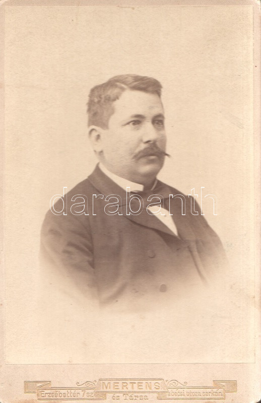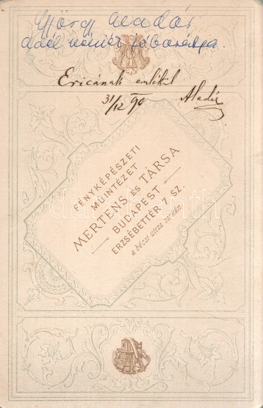 [Fotó] György Aladár (1844-1906) pedagógiai író, statisztikus, közíró aláírt, dedikált portréja (1890). Készült: Budapest, (1890). Mertens és Társa fényképészeti műintézet. 144x100 mm méretű fénykép egy kemény hátú, előnyomott, 165x118 méretű kartonon. György Aladár (1844-1906) hosszú, részben külföldön töltött bölcsészeti tanulmányok után a Vasárnapi Ujság és a Hon című lapok újságírójaként helyezkedett el. Pedagógiai, néprajzi és szociológiai cikkeket egyaránt írt. Nyikolaj Vasziljevics Gogol, Victor Hugo és Verne Gyula fordítója, az Országos Statisztikai Hivatal tisztviselője, a Magyar Néprajzi Társaság alelnöke volt, nem mellékesen a marxizmus egyik első hazai ismertetője. A fénykép hátoldalán dedikált: ,,Ericának emlékül Aladár. 31/12 80." Ugyanott ismeretlen kéztől való sorok: ,,György Aladár, Adél néniék jó barátja." Jó állapotú lap, a portré alatt és a fotókarton hátoldalán a fényképész cég aranyozott, előnyomott műtermi jelzésével.