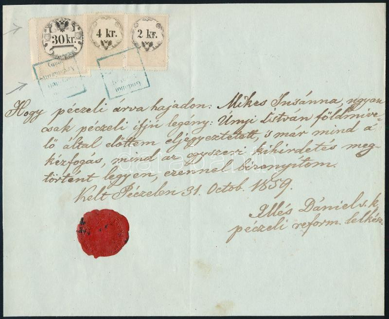 1859 Pécel, Illés Dániel református lelkész által kiállított eljegyzési bizonyítvány, 30+4+2kr okmánybélyeggel, viaszpecséttel