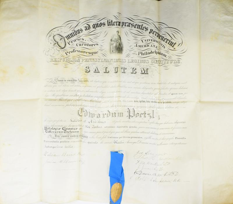 1873 Philadelphia Egyetem klasssica philologia díszes doktori diplomája, Edward Pötzl/Edward Poetzl részére, a kék szalag lejár.