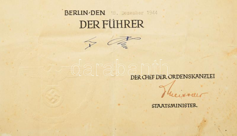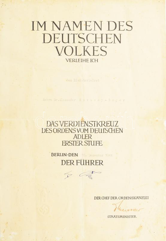 1944 Havassy-Bayer Sándor (1896k. - 1949) tanácsos kitüntetési oklevele, Adolf Hitler nyomtatott aláírásával