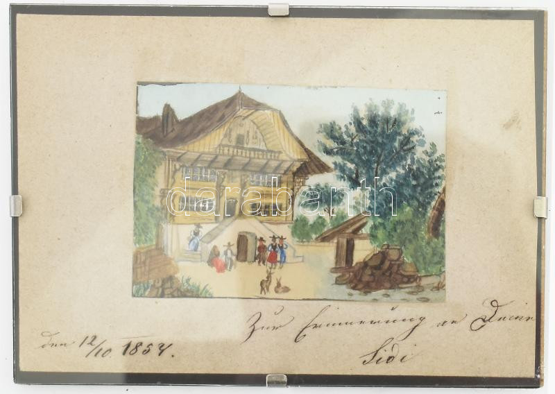 1854 Emlékkönyvből származó rajz és német nyelvű bejegyzés, üvegezett ...