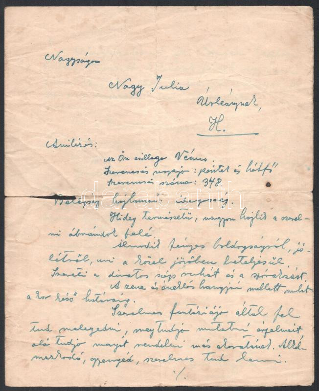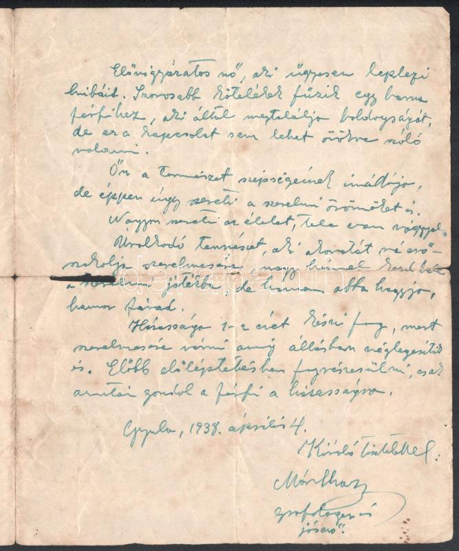 1938. ápr. 4. Gyula, grafológus-jósnő kézzel írt levele Nagy Júlia nevű hölgynek (személyiség-analízis), két beírt oldal, olvashatatlan aláírással, sérült