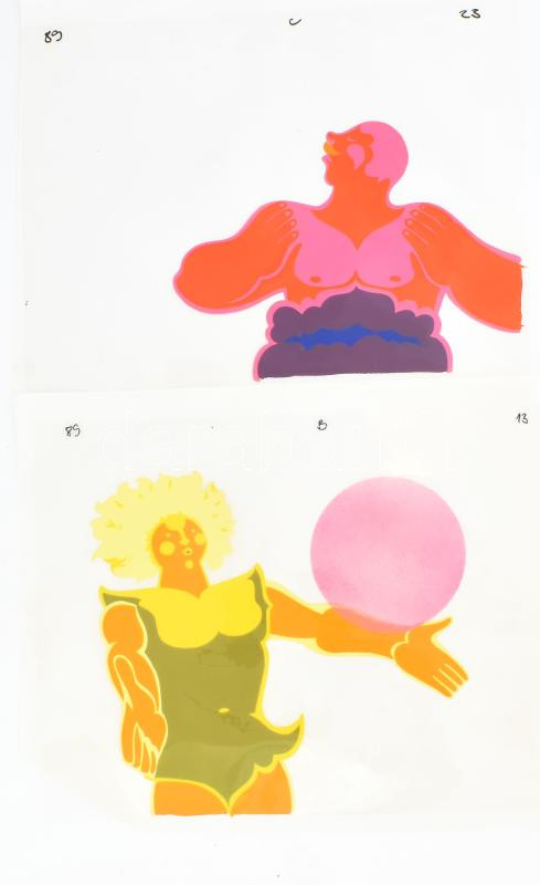 Description: 1981 Jankovics Marcell: Fehérlófia c. rajzfilmből származó két eredeti kézzel rajzolt figura. Vegyes technika, műanyag film. Animációtörténeti kuriózum 34x26 cm