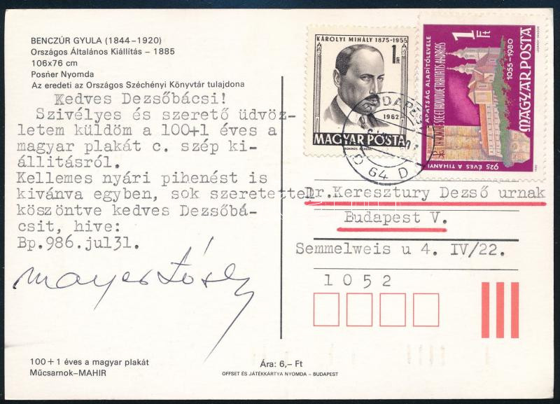 Description: cca 1986 Dr. Mayer József (1937-2014) MÁV főtanácsos, közlekedéstudományi műgyűjtő, szakíró gépelt képeslapja Keresztury Dezsőnek, Mayer József autográf aláírásával, eredeti borítékban.