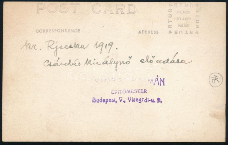 Description: 1919 Krasznaja Recska, Rjecska, Krasnaia- Rjetschka (Habarovszk, Khabarovsk); orosz, japán hadifogoly tábor. A foglyok Csárdáskirálynő előadása Fotólap 14x9 cm Hátoldalán Stobbe Kálmán (1883-1936) építőmester, labdarúgó, a magyar válogatott edzője írásával / Tsardasfürstin play in the Japanese-Russian POW (prisoner of war) camp, photo