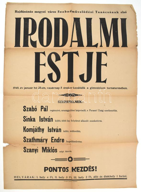 1948 "Hajdúnánás megyei város Szabadművelődési Tanácsának első Irodalmi Estje", 1948. jan. 25., Szabó Pál regényíró, Sinka István, Komjáthy István költő, Szathmáry Endre hegedűművész, Szanyi Miklós nép táncos részvételével. Hajdúnánás, "Táncsics"-ny., hajtott, sérült, 83x59 cm