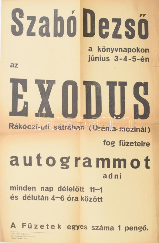 cca 1940 Szabó Dezső a könyvnapokon az Exodus Rákóczi-uti sátrában (Ur... https://www.darabanth.com/en/478-Online-auction/478.0/Art-and-other-collectibles/Posters~295/cca-1940-Szabo-Dezso-a-konyvnapokon-az-Exodus-Rakoczi-uti-satraban-Urania-mozinal-fog-fuzeteire~II3261912