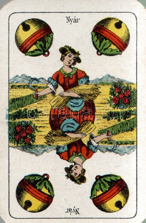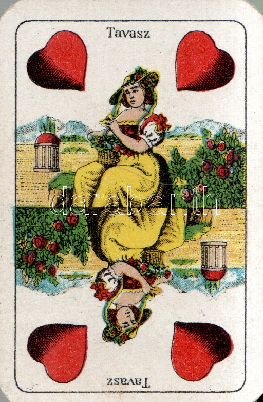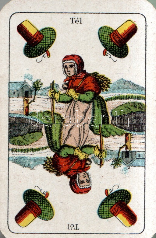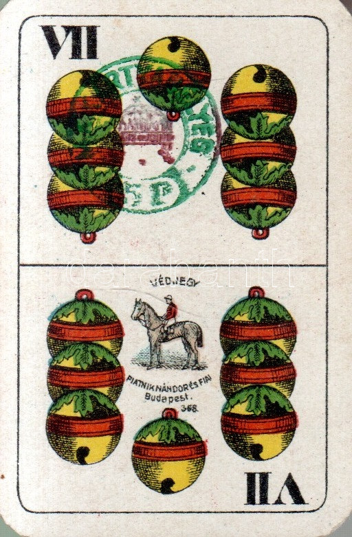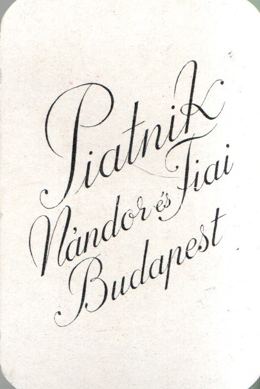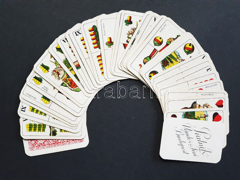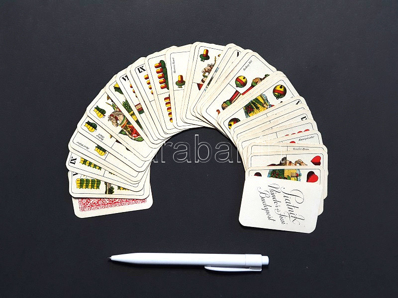 [Kártyacsomag.] Miniatűr magyarkártya-csomag. (1930-as évek) Budapest, (1936 körül). Piatnik Nándor és Társa. Színes kőnyomat (32 + 1), lapméret: 67x44 mm. A 32 lapos játékkártya-csomagoknak számtalan nemzeti változata létezik, ebből nálunk a legismertebb a Tell- avagy Évszakok-kártyacsomag, melynek négy színe a négy évszak szerint sorakozik, a kártyalapokon pedig a Tell Vilmos-mondakörből származó svájci szabadsághősök és svájci tájak díszelegnek. A Tell- avagy Évszakok-kártyacsomagnak azonban két, ikonográfiájában eltérő konvenciója létezik, a német és a magyar. A budapesti Piatnik Nándor és Társa által kiadott miniatűr Tell-kártyacsomag piros, tök, makk ász lapján női portré szerepel, a zöld ászon férfi-női páros; ez eltér a Tell-kártya magyar konvencióitól, mely szerint a piros ászon női, ám a tök, zöld és makk ászon férfi portré kell szerepeljen (https://www.altacarta.com/overview/tell.html). Minden összevéve tehát miniatűr magyarkártya-paklink a Tell-pakli német ikonográfiájú, ritkább változata. Kártyapaklink tök hetes lapján, a Piatnik védjegye fölött hitelesítő kártyabélyegzés, a védjegy alatt 368. sorszámjelzés található. 32 lapos kártyapaklinkhoz Piatnik feliratozású pótlap csatlakozik. Jó állapotú lapok.
