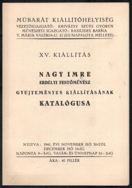 Description: Nagy Imre erdélyi festőművész gyűjteményes kiállításának katalógusa, Műbarát Kiállítóhelység, Budapest, 1941. 3 sztl oldal. A tételhez tartozik 2 db korabeli újságcikk Zsögödi Nagy Imréről, az egyik a kiállításáról reprodukcióval, fotókkal.