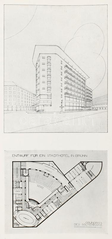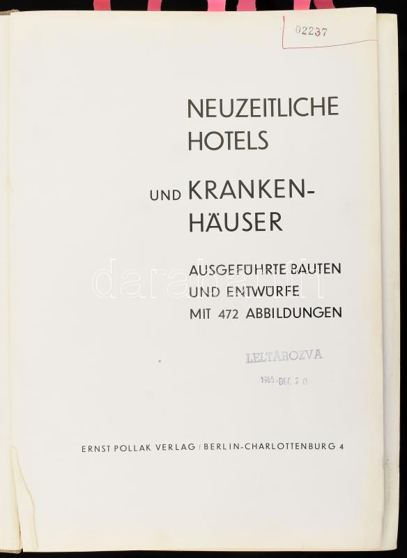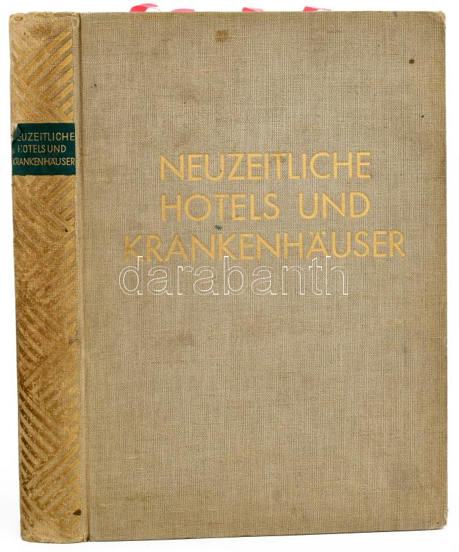 Neuzeitliche Hotels und Krankenhäuser. Ausgeführte Bauten und Entwürfe. Mit 472 Abbildungen. Berlin,én.,Ernst Pollak, VIII+445 p. Német nyelven. Fekete-fehér képanyaggal illusztrált. Kiadói aranyozott egészvászon-kötés, kopott, foltos borítóval, régi intézményi bélyegzésekkel, laza fűzéssel, szakadt címlappal.