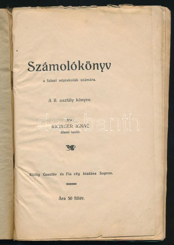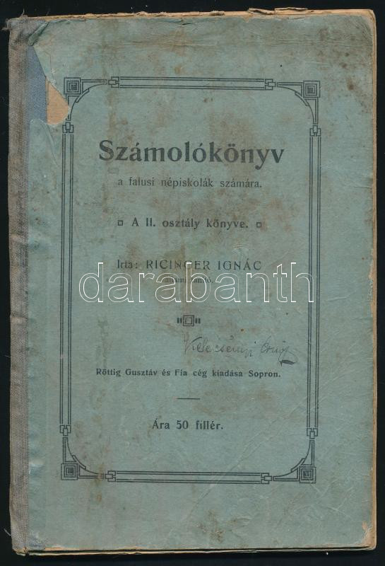 Ricinger Ignác: Számolókönyv a falusi népiskolák számára. A II. osztály könyve. Sopron, Rötting. Félvászon kötés, viseltes állapotban.
