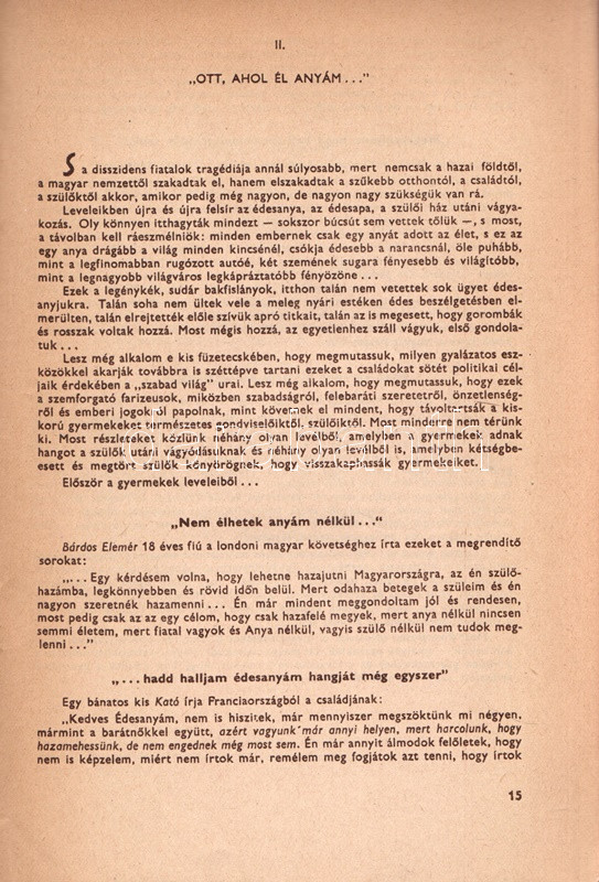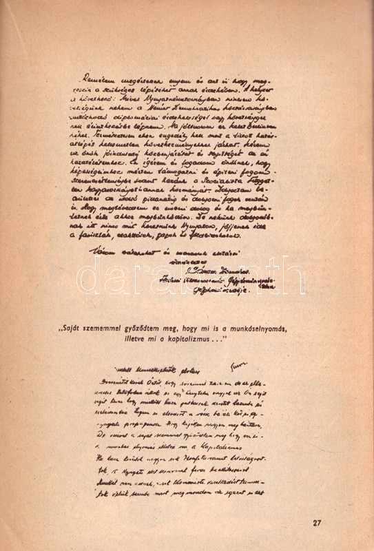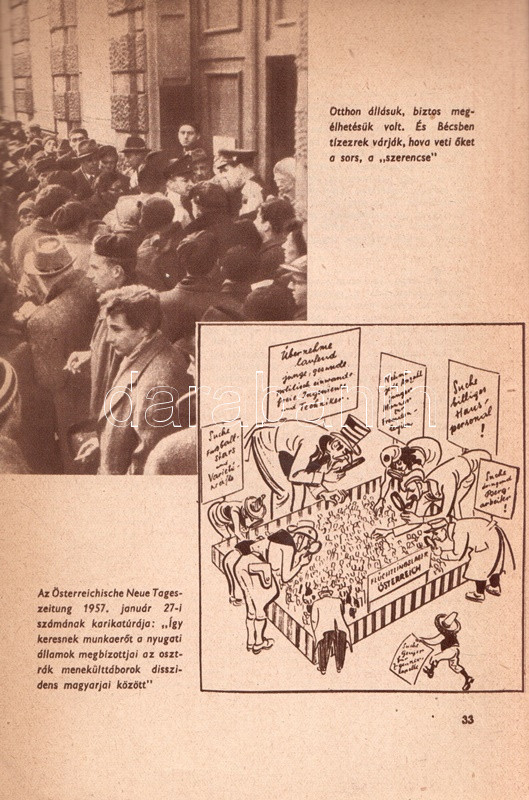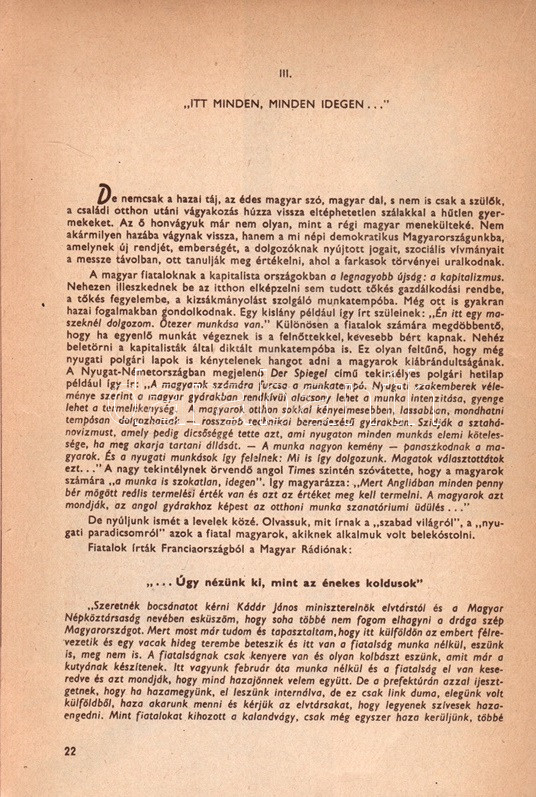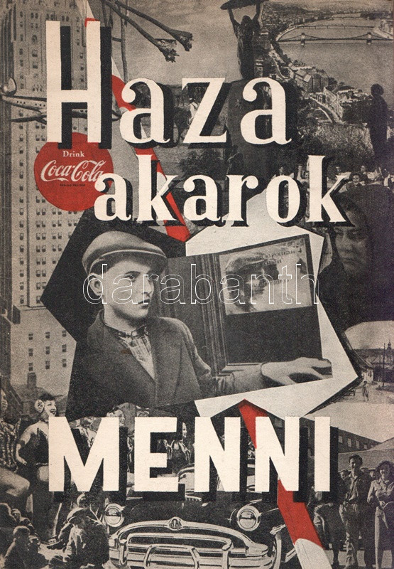 ,,Haza akarok menni..." Vallomás és vádirat. Összeállította Szilágyi Edit. [Budapest], (1957). (Magyar Kommunista Ifjúsági Szövetség - Athenaeum Ny.) 47 + [1] p. A frissen alakult KISZ propagandakiadványa, oldalszámozáson belül számos szövegközti fotóval. A kiadvány valódinak beállított dokumentumok alapján mutatja be az 1956-ben az országot elhagyó fiatalok honvágyát, illetve külföldi tartózkodásukban átélt változatos nyomorúságait. A propagandaanyag érveléstechnikája igen korjellemző, sajátos, lehatárolt, állításai egyszerre ellenőrizhetetlenek és fölöttébb kétesek, ennek ellenére jól bemutatják az imperializmus elleni kommunista retorika felépült érvrendszerét. Fűzve, színes, fotómontázzsal illusztrált kiadói borítóban.