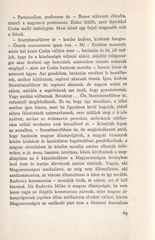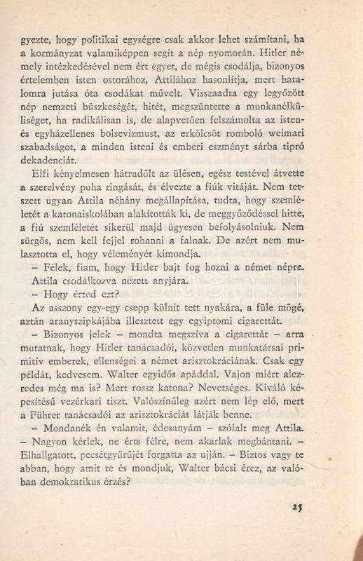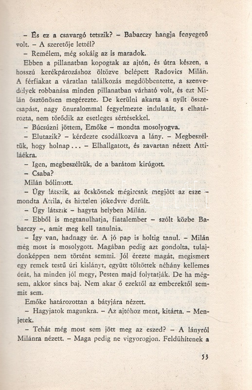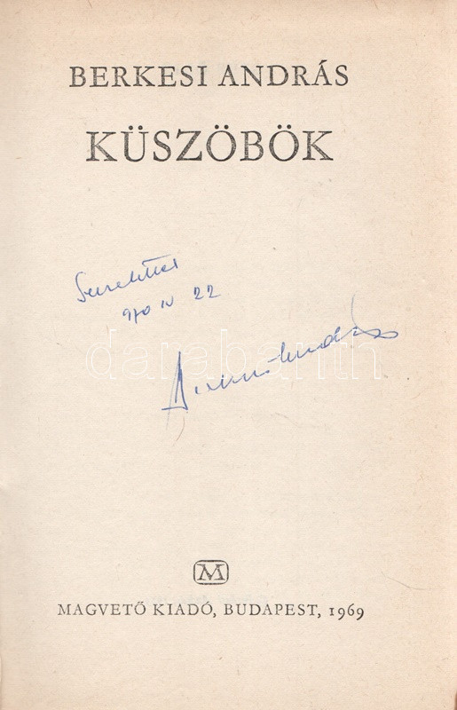 Berkesi András: Küszöbök. [Regény.] (Dedikált.) Budapest, 1969. Magvető Könyvkiadó (Athenaeum Nyomda). 526 + [2] p. Első kiadás. Dedikált: ,,Szeretettel Berkesi András. 970. IV. 22." Berkesi András (1919-1997) ÁVH-s vallatótiszt, lektűríró, dramaturg, a Kádár-kor rendkívül futtatott krimi- és kalandregényírója. Melodramatikus elemekkel fűszerezett, leleplező szándékú regényét a német nemzetiszocialista rendszer éveibe helyezi; a regény magyar főhősei ugyancsak jól tájékozottak, és szabad idejüket éleslátásról tanúbizonyságot tevő politikai helyzetanalízissel múlatják, illetve Radovics Milán magyar kommunista hős sorsán tépelődnek, aki a regény végén életét adja a szabadságért. Az egyértelmű morális pozíciókat kiosztó politikai kalandregény számos kiadást megért. Az első előzéken ajándékozási bejegyzés, néhány levél sarkán apró, a szövegtükröt nem érintő foltosság. Kiadói egészvászon kötésben, színes, enyhén sérült kiadói védőborítóban. Jó példány.