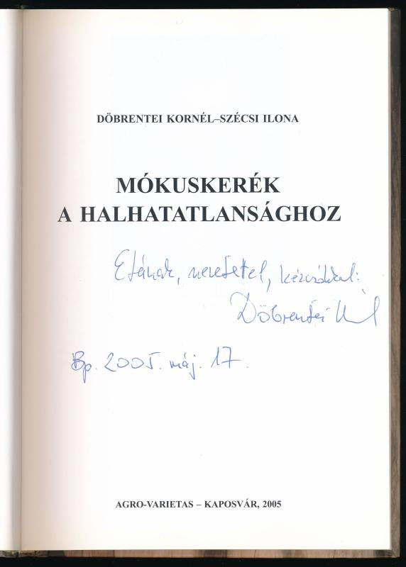 Döbrentei Kornél - Szécsi Ilona: Mókuskerék a halhatatlansághoz. (Dedikált!) Kaposvár, 2005, Agro-Varietas. Fekete-fehér fotókkal illusztrálva. Kiadói kartonált papírkötés. A szerző, Döbrentei Kornél (1946- ) József Attila-díjas író, költő, újságíró által dedikált példány.