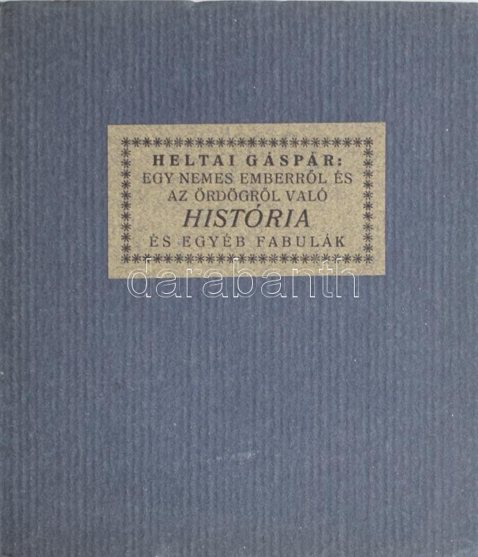 Heltai Gáspár: Egy nemes emberről és az ördögről való história, mellyet egyéb fabulákkal és lött dolgokkal egyetemben Heltai Gáspár irásiból kiszedegetett és ím újra napfényre bocsátott Király György deák. (Utószó: Király György.) Gyoma, 1942. Kner Izidor (ny.) 95 + [1] p. A Kozma Lajos négy egész oldalas fametszetű illusztrációjával és könyvdíszeivel kísért munka első kiadása 1920-ban jelent meg, az 1942-es újranyomás során 1000 új példány látott napvilágot. Lévai-Haiman 1.555. Fűzve, kékesszürke, merített kiadói borítóban, az első fedőborítón a címfelirat drapp vignettán. Jó példány.