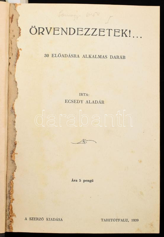 Kolligátum különféle művekből: Ecsedy Aladár: Örvendezzetek!...; A rabszolgaleány.; A lélek szolgálatában. Tahitótfalu, 1939-1944., Szerzői. Szabó Balázs: Mese az édesanyáról. hn., 1929, Sylvester kiadás.; Nagy Gyula: Rkie-sajtóest műsora. Összeáll.: - -. Bp., én., Református Keresztyén Ifjúsági Egyesületek.; Bányai Irén: Máskara. hn., én., Misztófalusi.; Móra Ferenc: A jisten foltozó-szűcse. (Népi műsortár 18.) hn., én., Misztófalusi.; Györkössy Endre: A "maszlag." Újpest-Újváros, én., Újpest-Újvárosi Református Presibtérium.; Németh László: Cseresnyés. Bp., 1942., Exodus.; Katona József: Luca széke. Bp., 1942., Exodus.; Átkötött félvászon-kötés.