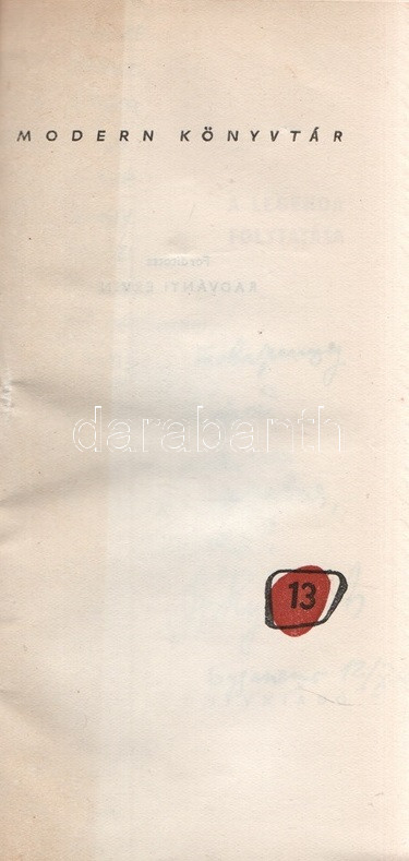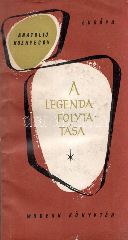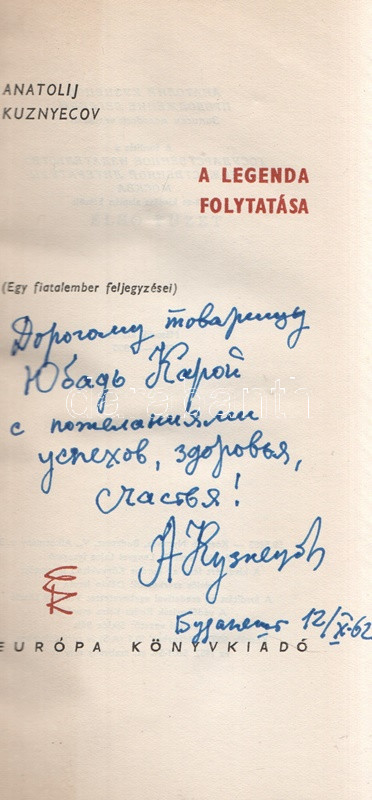Kuznyecov, Anatolij: A legenda folytatása. (Egy fiatalember feljegyzései.) (Dedikált.) (Budapest, 1959). Európa Könyvkiadó (Kossuth Nyomda). 246 + [2] p. Második kiadás. Anatolij Kuznyecov (1929-1979) orosz-ukrán író bemutatkozó novellaciklusa a szibériai építőmunka világáról. A címlapon a szerző saját kezű, orosz nyelvű dedikációja Jobbágy Károly műfordító számára. A dedikáció Budapesten kelt, 1962. október 12-én. A szatirikus betétekkel tarkított beszámoló jelentős cenzúrázás után jelenhetett meg a szovjet Junoszty folyóirat 1957. évi számaiban. A megjelentetést valamelyest megkönnyíthette a szerző párttagsága, illetve a mű termelési irányzatossága, amelyet azonban erősen ellenpontoz a szöveg időnkénti ironikus hangvétele. A második világháborús ukrán népirtás témáját is feldolgozó szerző 1968-ban, a csehszlovák beavatkozás után végleg elhagyta a Szovjetuniót. (Modern könyvtár, 13. kötet.) Prov.: Jobbágy Károly. [Jobbágy Károly (1921-1998) költő, orosz műfordító, gimnáziumi tanár és könyvtáros.] Fűzve, Rudas Klára által tervezett színes védőborítóban. Jó példány.