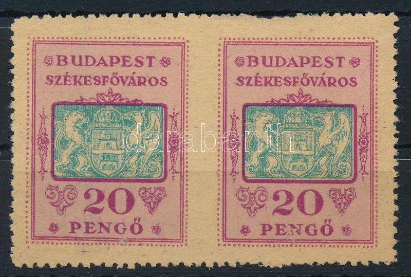 Description: 1945 Budapest Székesfőváros 20P forgalmi adó bélyeg, középen fogazatlan pár 10 1/2 fogazással (hiányos fogak, sérült kép / missing perfs., demaged front side)