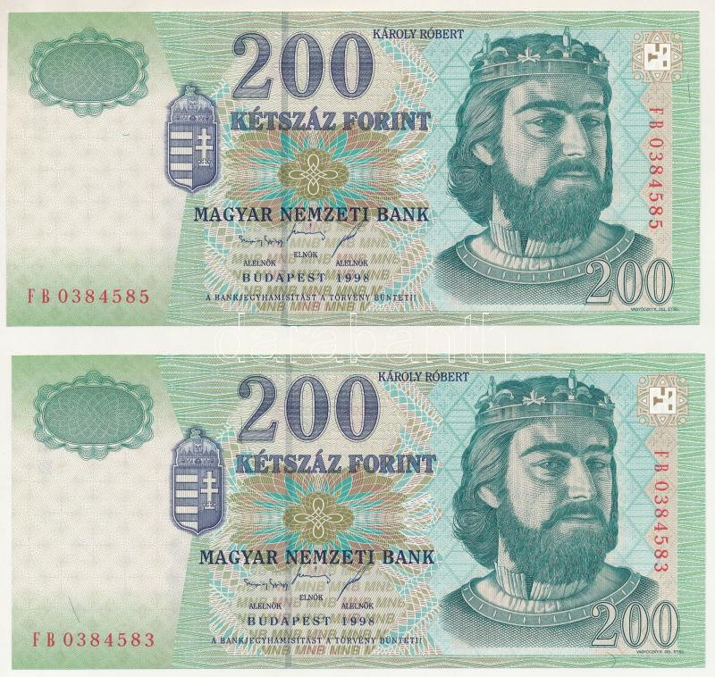https://www.darabanth.com/en/478-Online-auction/478.0/Numismatics/Hungarian-Banknotes~2000008/1998-200Ft-2x-egyugrasos-sorszamkovetok-FB-0384583-es-FB-0384585-T-UNC-AU~II3261972