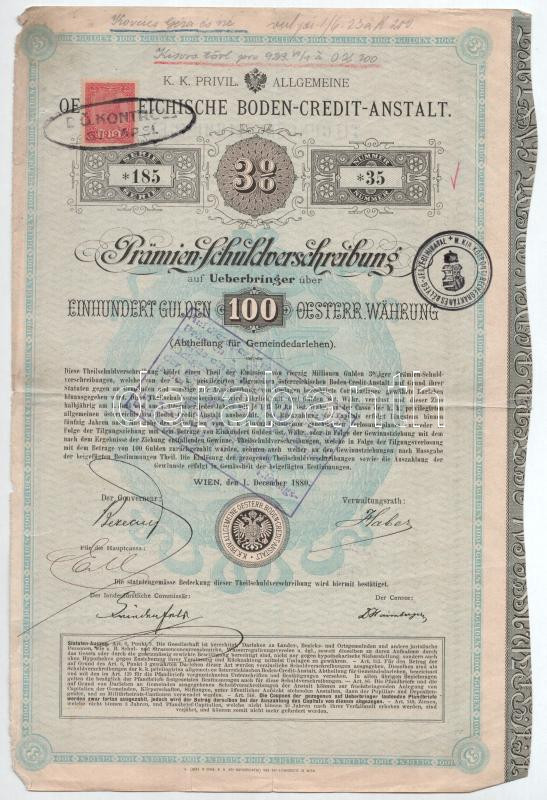 Hungary 1880. 3% interest State Loan about 100 Gulden, with "*185 *35" serial number, with overprints and an 1919. stamp C:F