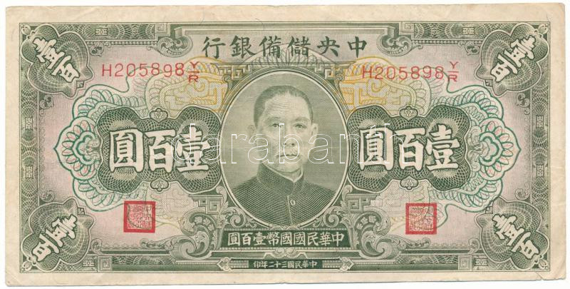 Kína / Japán megszállás 1943. 100Y "Central Reserve Bank" T:F,VG jobb ... https://www.darabanth.com/en/478-Online-auction/478.0/Numismatics/Worldwide-banknotes~2000015/Kina-Japan-megszallas-1943-100Y-Central-Reserve-Bank-T-F-VG-jobb-also-saroknal-nagyobb~II3250524