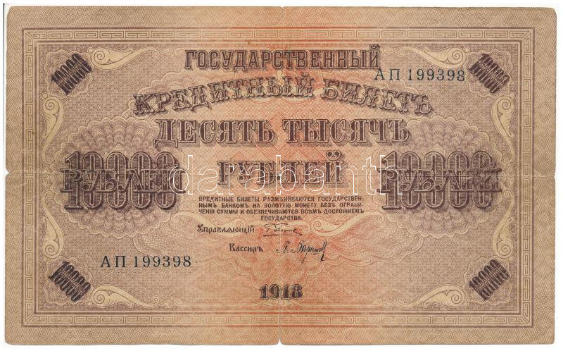 Szovjetunió / Orosz Szocialista Szövetségi Szovjet Köztársaság 1918. 1... https://www.darabanth.com/en/478-Online-auction/478.0/Numismatics/Worldwide-banknotes~2000015/Szovjetunio-Orosz-Szocialista-Szovetsegi-Szovjet-Koztarsasag-1918-10000R-T-VG-nagyobb-szakadas~II3262022