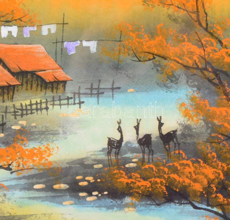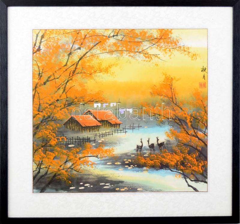 Li Hui: Táj, őzekkel. Kínai selyem kép. Akvarell, jelzett, üvegezett keretben 34x34 cm