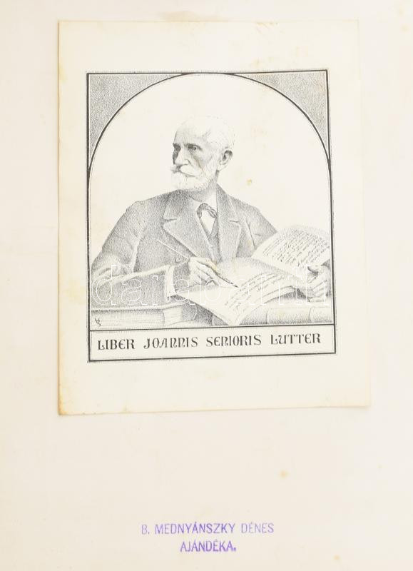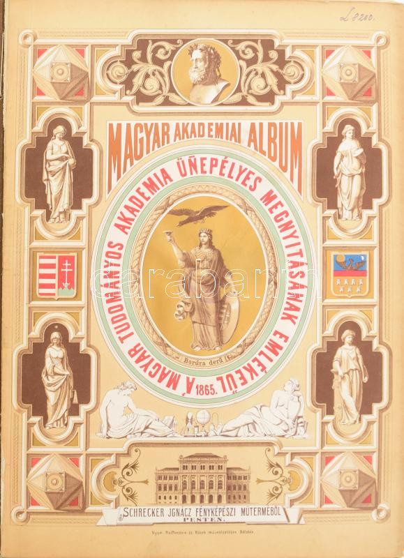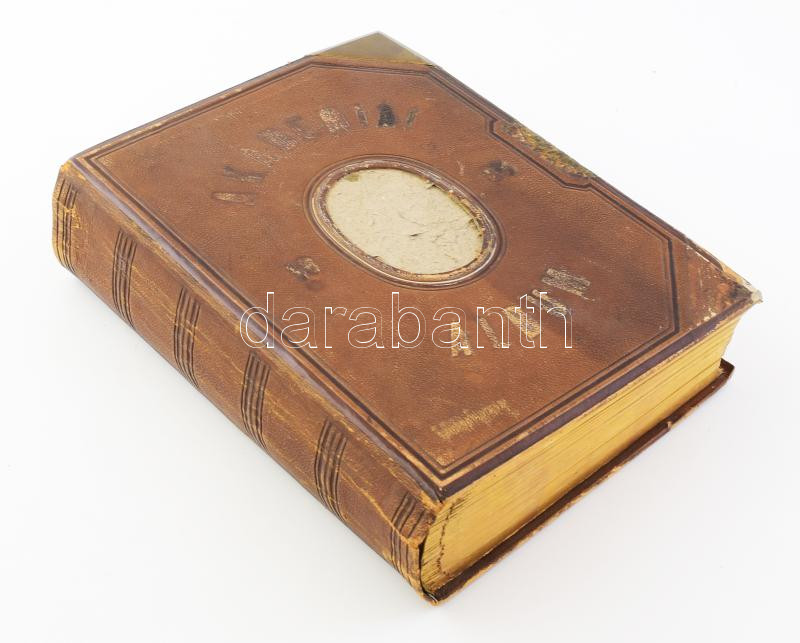 1865 Magyar Akadémiai Album. A Magyar Tudományos Akadémia ünnepélyes megnyitásának emlékéül. Pest, Schrecker Ignác fényképészeti műterme (Bécs, Reiffenstein és Rösch-ny.) Benne 1 db azonosítandó (nem megfelelő névnél szereplő) fotóval, egyébként üres. Aranyozott egészbőr-kötésben, sérült, viseltes állapotban, a borítón hiányzó plakettel és fémveretekkel, helyenként szakadt lapokkal, "B. Mednyánszky Dénes ajándéka" bélyegzéssel, ex libris-szel.