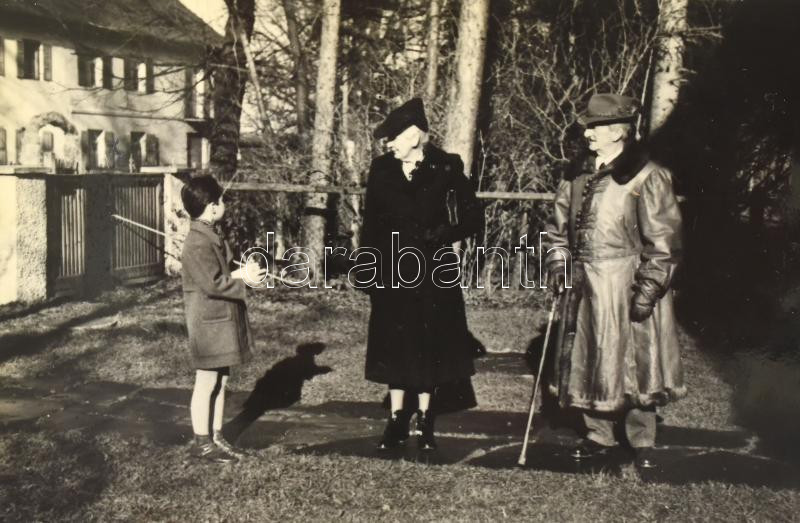 1947 Horthy Miklós, Horthy Miklósné és ifj. Horthy István a bajországi Weilheimben, fotó, a hátoldalán feliratozva, 6x10 cm