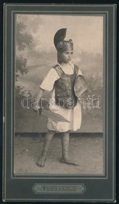 cca 1900 Római katonának öltözött gyermek. kabinetfotó 10x17 cm