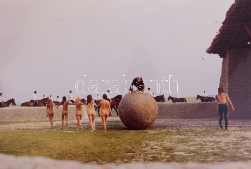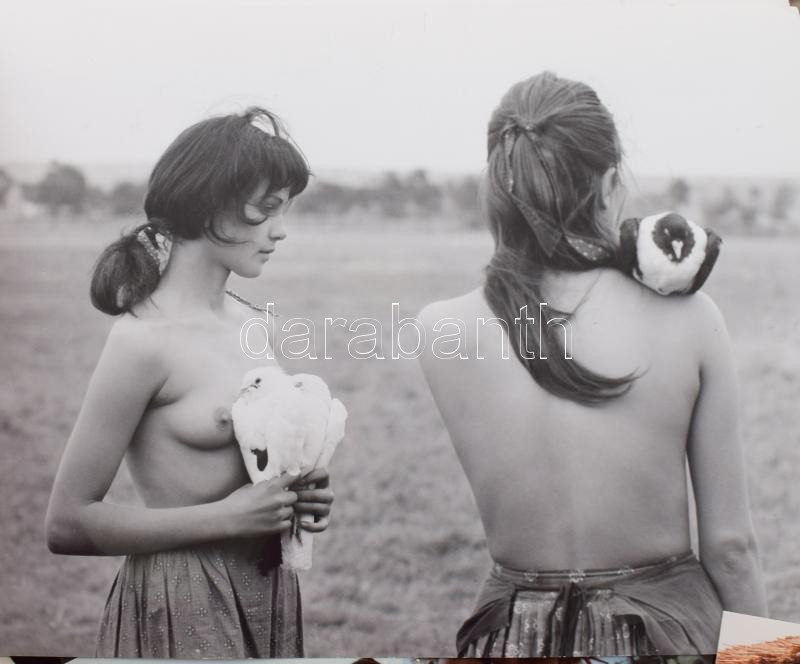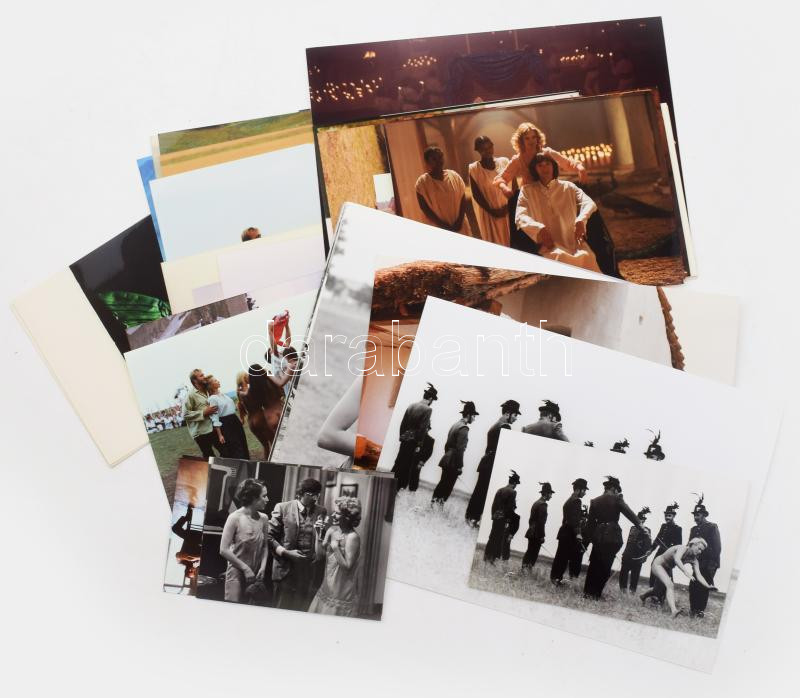 cca 1970 - 1980 Vegyes film fotó tétel, nagyrészt Jancsó Miklós műveiből, de közte 1 Jirí Menzel filmből való fotókkal is, közte Szegénylegények, Szerelmem, Elektra, Allegro barbaro, A zsarnok szíve, avagy Boccaccio Magyarországon, Fényes szelek, Még kér a nép, Isten hátrafelé megy, Felhőjáték, Álmodó Ifjúság, A magzat c. filmekből, kb. 50 db fotó, köztük erotikus töltető fotók is, egy "Szegény legények" (Veszőfutás) fotó hátoldalán Inkey Tibor pecsétjével. [Talán a többi is Inkey Tibor fotó???] A fotók hátoldalain bejegyzésekkel, köztük nyomdai előkészítésre, 18x23 cm és 9x12 cm közötti méretben.
