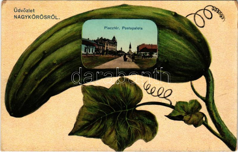 1912 Nagykőrös, Piactér, Postapalota. Geszner Jenő kiadása, montázs uborkával (kopott sarkak / worn corners)
