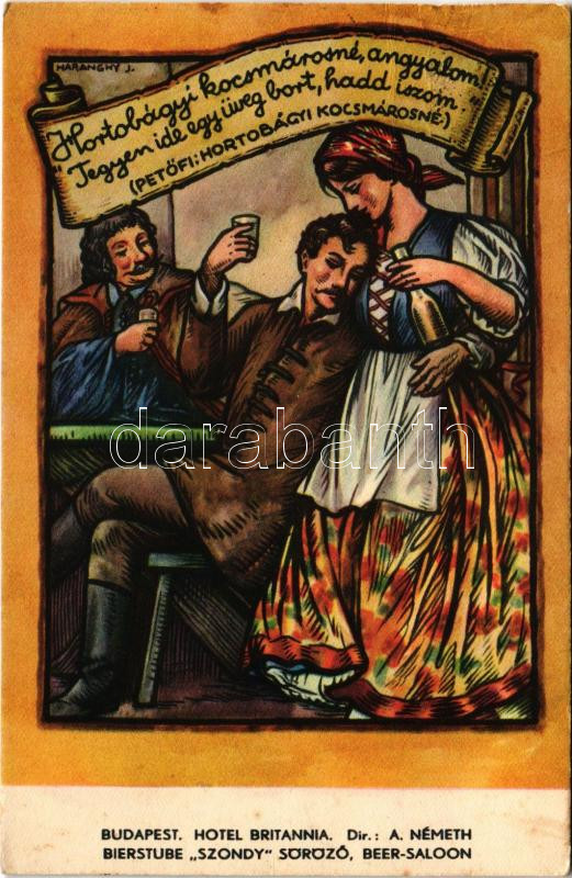 1939 Budapest VI. Hotel Britannia és Szondy söröző grafikai reklámlapja s: Haranghy J. (Rb)