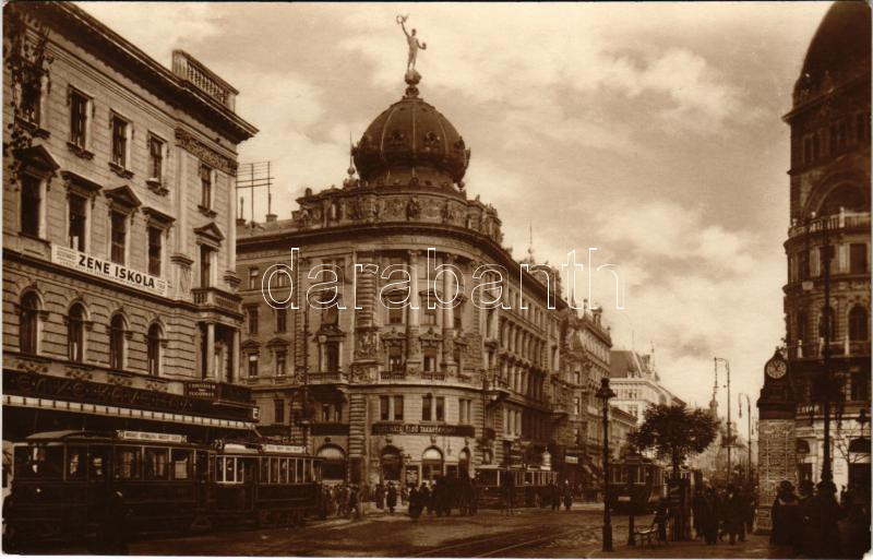 Description: Budapest VIII. Rákóczi utca (Blaha Lujza tér), 23-as és 1-es villamosok, Józsefvárosi zeneiskola fiókja, Emke kávéház, Dr. Bonyhád M. fogorvos, Pesti Hazai Első Takarékpénztár, gyógyszertár