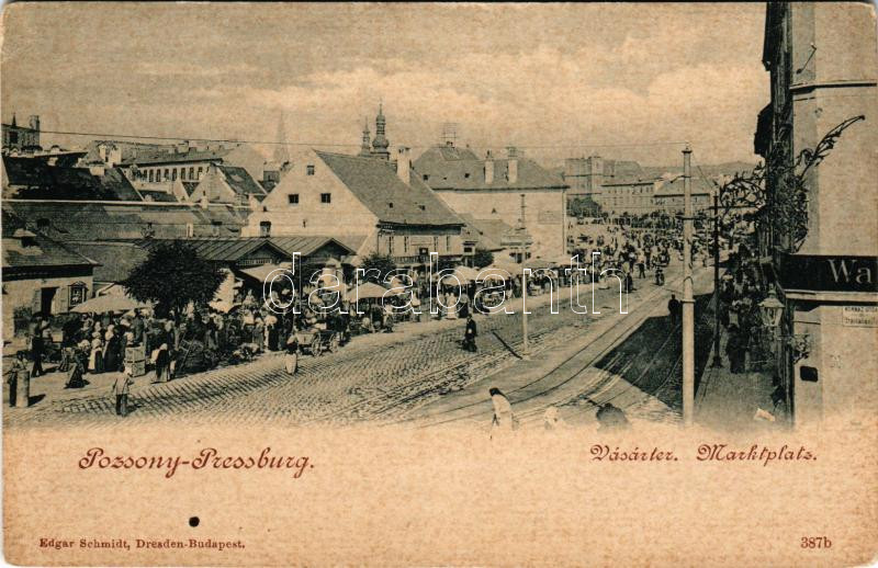 Pozsony, Pressburg, Bratislava; Vásártér és Kórház utca, piac árusokka...