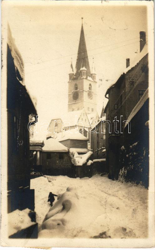 Description: 1925 Nagyszeben, Hermannstadt, Sibiu; Hundsrücken / Evangélikus templom télen, óriás hótakaró / Lutheran church in winter, huge snow cover. Fotografie Original Emil Fischer