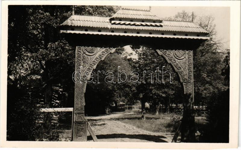 Description: Székelykeresztúr, Kristur, Cristuru Secuiesc; Tanítóképző székely kapuja. Nagy Béla fényképész kiadása / Transylvanian wood carved gate of the teachers training institute (vágott / cut)