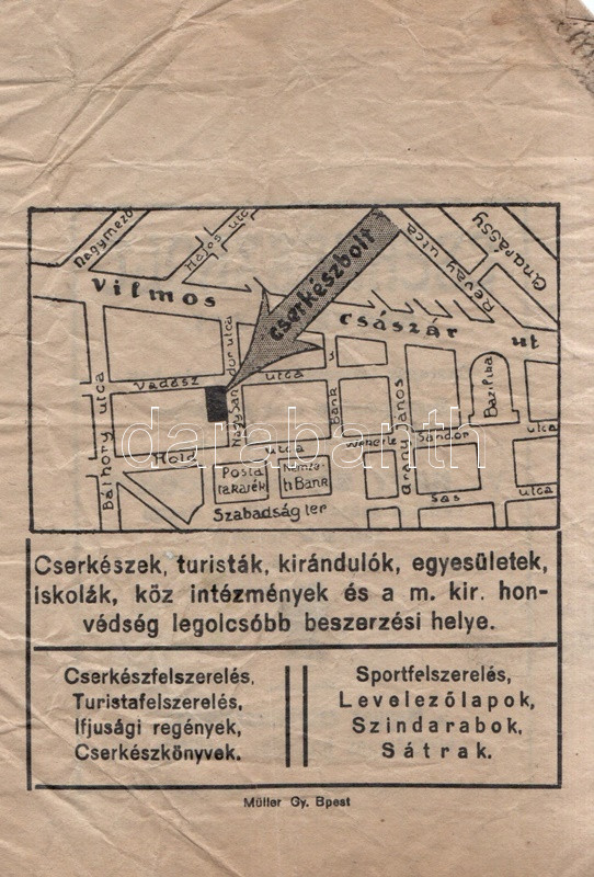Description: Cca 1930-1940. A Cserkészbolt Szövetkezet (a Magyar Cserkészszövetség kizárólagos hivatalos szállítója) reklámos papírzacskója, hátoldalán a Cserkészház elhelyezkedésének térképével. Mérete: 160x110 mm, kisebb gyűrődésekkel.