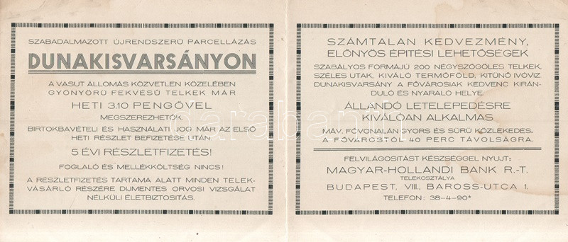 Description: Cca 1930. Dunavarsány. "A boldog jövő titka, szabadalmazott újrendszerű parcellázás Dunakisvarsányon". A Magyar-Holland Bank Rt. négy oldalas, illusztrált reklámnyomtatványa. Egy félbehajtott levél, teljes mérete: 128x295 mm, az első oldal tetején aprócska sérülés.