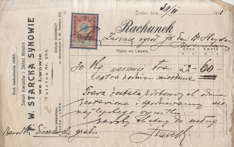 Description: Lwów [Lviv, Lemberg], 1911. Salon Kwiatów i Sklad Nasion [virág- és magkereskedés] F. W. Starcka Synowie fejléces számlája, felragasztott 2 Heller értékű (Osztrák-Magyar Monarchia) illetékbélyeggel. Mérete: 150x235 mm, két kisebb beszakadással.