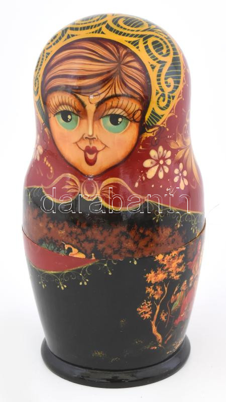 Description: Kézzel festett 7 részes orosz matrjoska baba szett, egyik darabon jelzett, mindegyik babán más-más klasszikus orosz mesejelenettel festett, m: 18 cm alatt