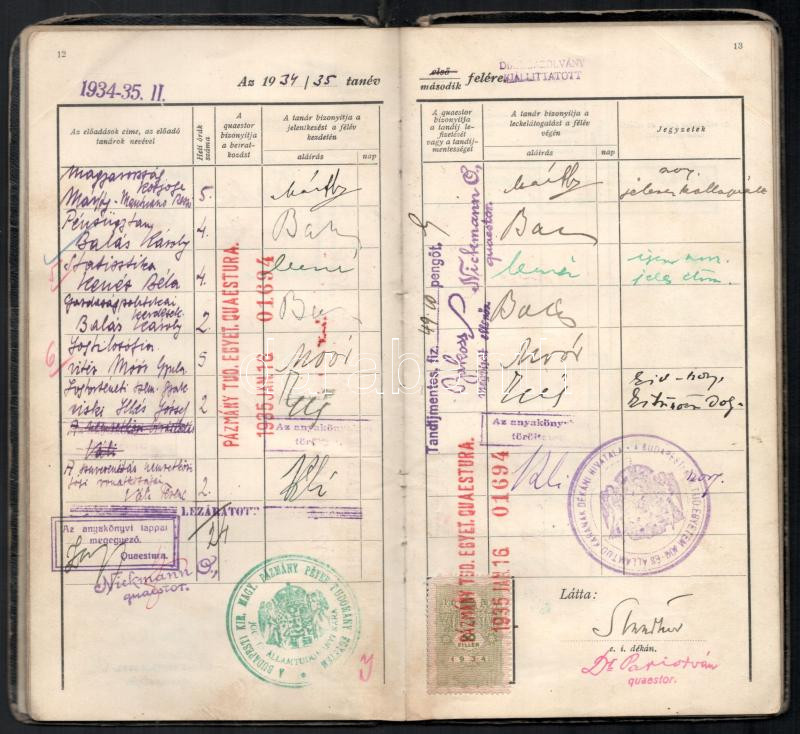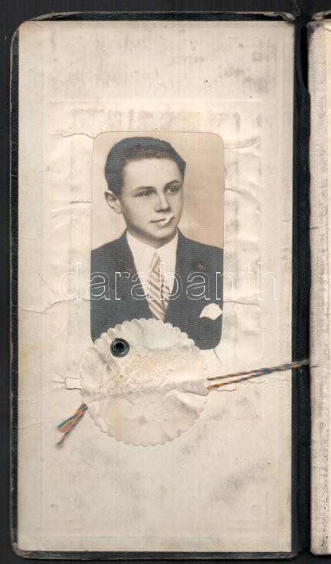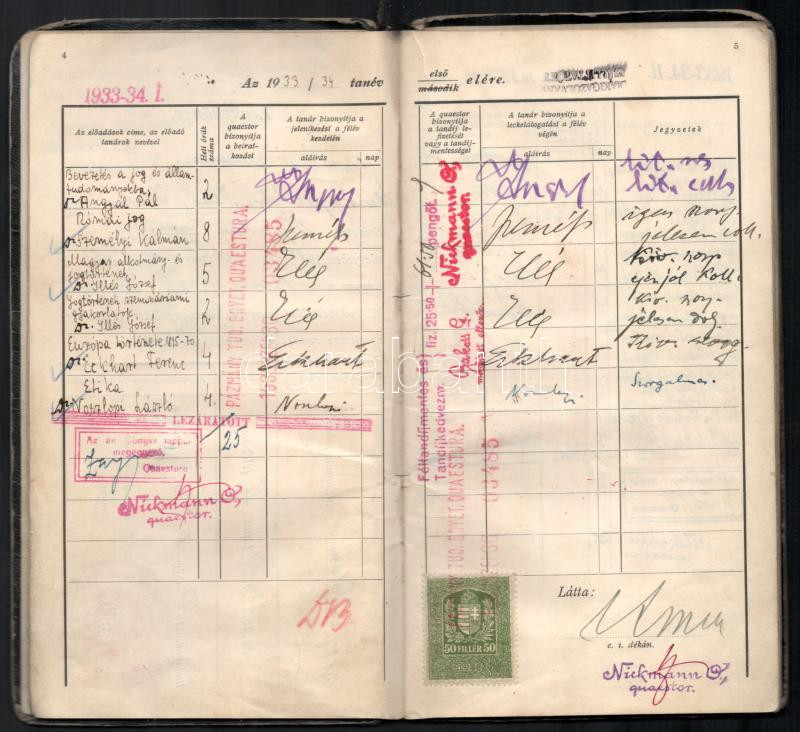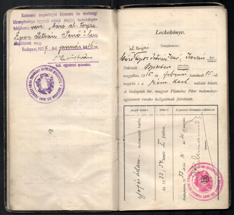1933-37 báró Apor István (1915-1969) későbbi jogász, huszárzászlós budapesti egyetemi fényképes leckekönyve, többek közt Angyal Pál, Személyi Kálmán, Viski Illés József, Eckhart Ferenc, Kenéz Béla, Balás Károly, vitéz Moór Gyula és mások autográf aláírásaival, papírfelzettel, okmánybélyegekkel, korabeli vászonkötésben, néhány kevés lapon apró sérülésekkel
